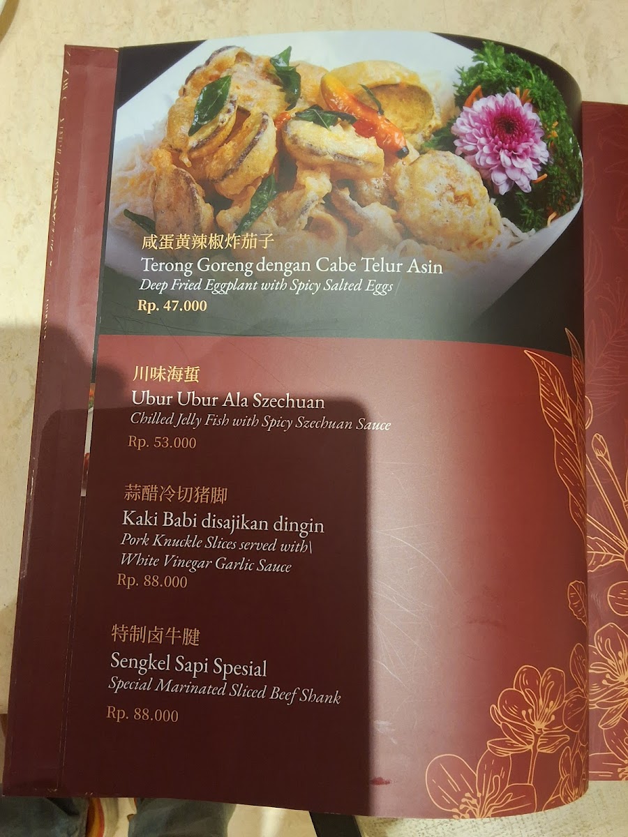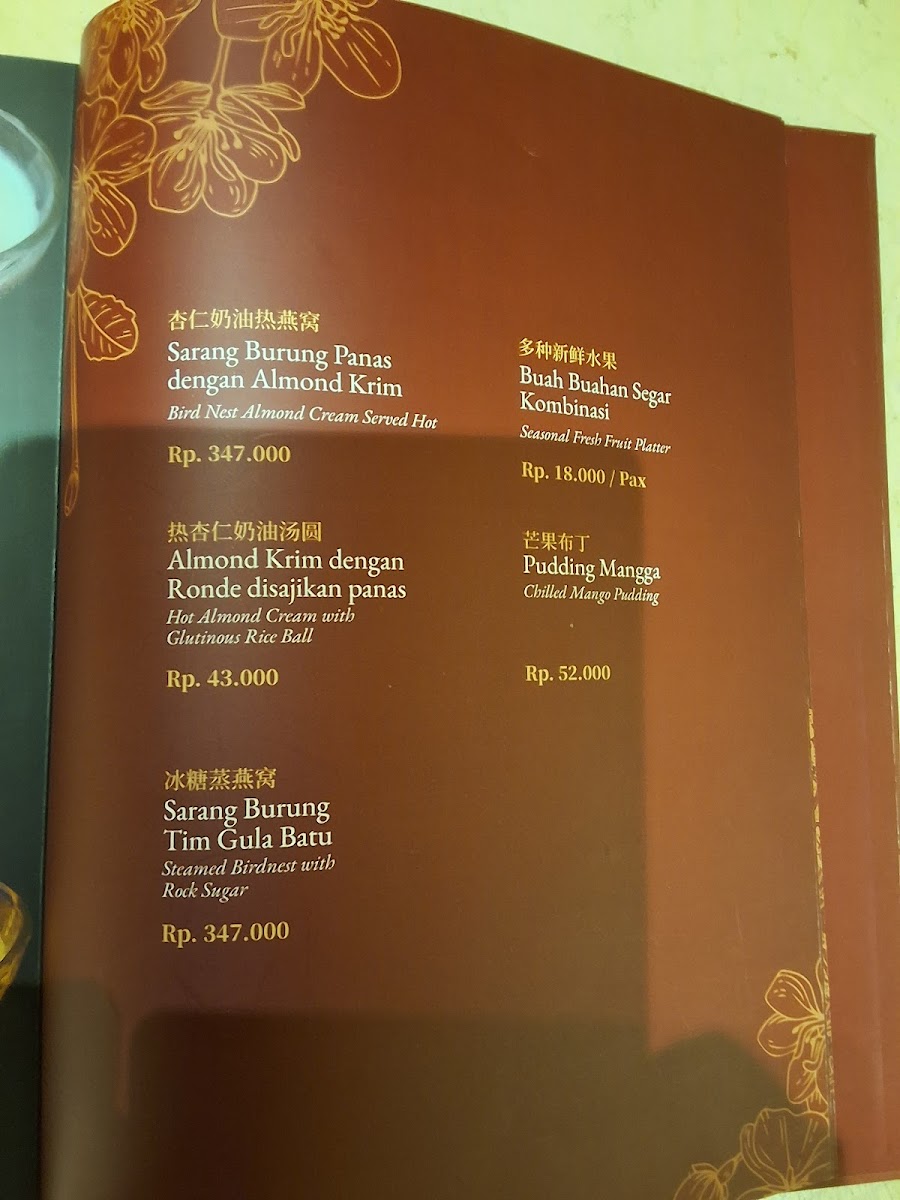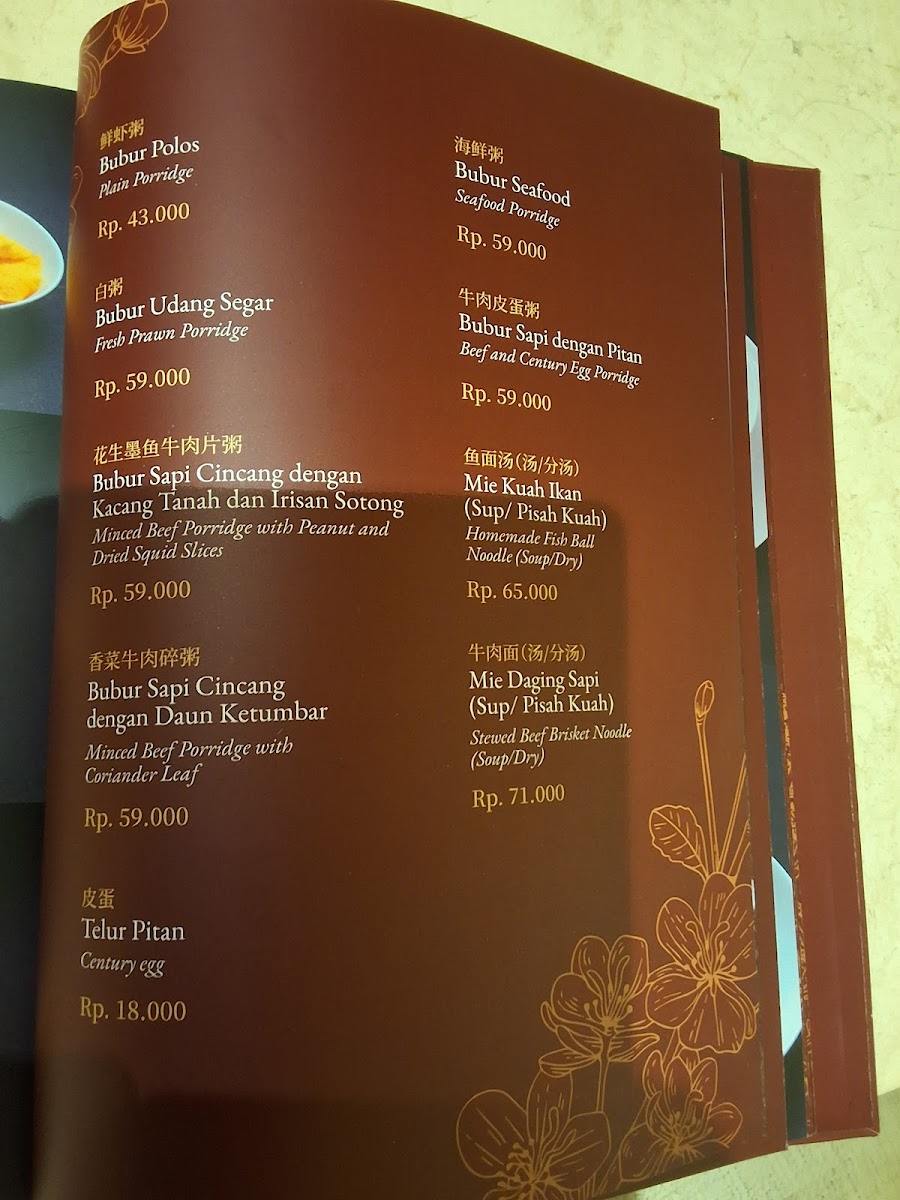 Ming Yuan offers a delightful menu that combines traditional flavors with a modern twist, making it a standout choice in Semarang. The menu features a variety of options that cater to all tastes, but a few dishes truly shine. Tim Kulit Tahu Saus Tiram is a crispy, savory appetizer that blends tofu skin with a rich oyster sauce, while the Suckling Pig Combination offers a delectable variety of roasted meats. For dim sum lovers, the Pao and Dimsum are must-tries, with the dumplings bursting with flavor and texture. The Cheongfan Udang, shrimp-filled rice rolls, is another standout, offering a perfect balance of delicate flavors. For those seeking a unique dessert, the Ronde Almond and Tan Tart are delightful choices, providing a sweet and satisfying finish. The Bubur Ayam Dan Telur Phitan, a comforting chicken and preserved egg porridge, is perfect for a warming meal, while the 蘿蔔糕 (Turnip Cake) offers a deliciously savory alternative. For lighter options, the Chicken Soup with Corn and the refreshing Es Campur provide a satisfying yet light meal. The Fish Filled and Century Egg with Spring brings a flavorful mix of textures, and the Tahu Dengan Sapi Cincang combines tofu and minced beef in a savory dish. Lastly, the Samcan Goreng offers a perfectly crispy and tender pork belly dish that adds to the restaurant’s diverse menu. Ming Yuan’s combination of traditional and contemporary flavors makes it an excellent choice for anyone looking for an authentic, high-quality dining experience.